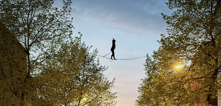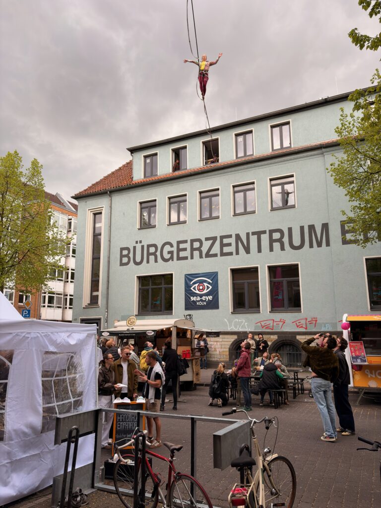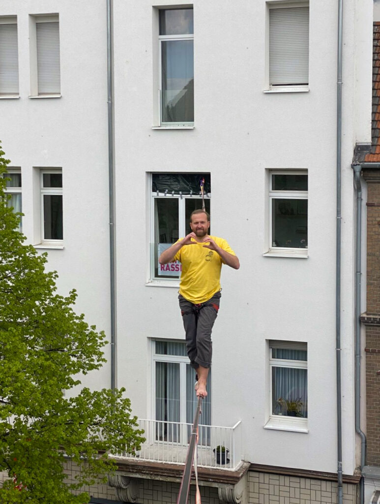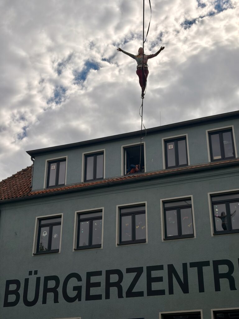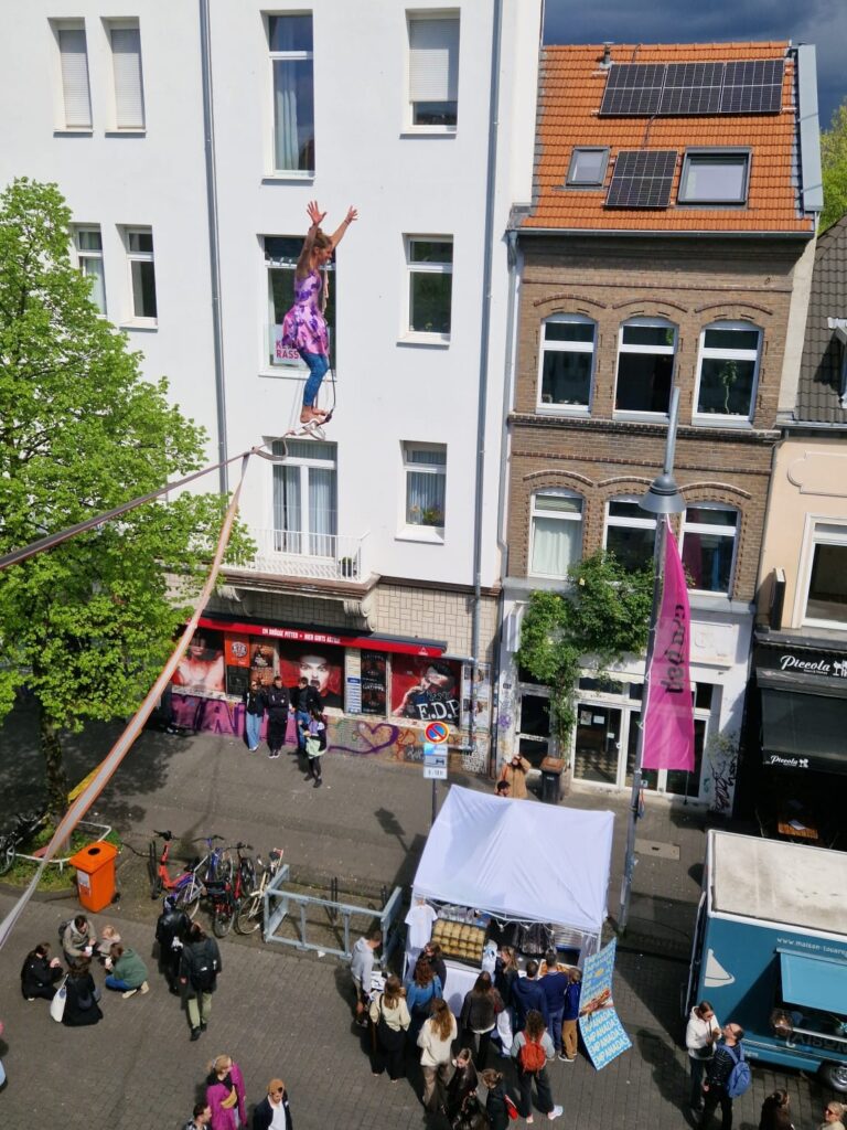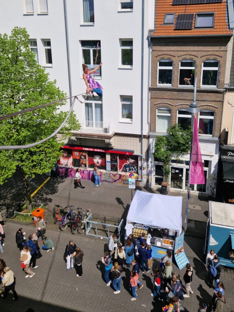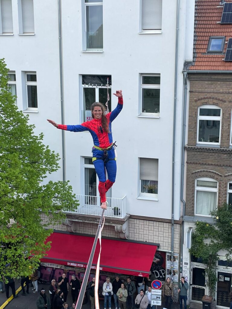 Von Freitag bis Sonntag haben wir das Straßenfest aus der Vogelperspektive begleitet. In rund zehn Metern Höhe zeigten unsere Vereinsmitglieder verschiedene Akrobatik-Elemente auf dem Band. Es war eine tolle Erfahrung, die Konzentration beim Laufen beizubehalten, während direkt unter uns das bunte Treiben des Festes stattfand. Die Resonanz der Zuschauer war durchweg positiv, und viele blieben stehen, um den Balanceakt über der Straße zu verfolgen.